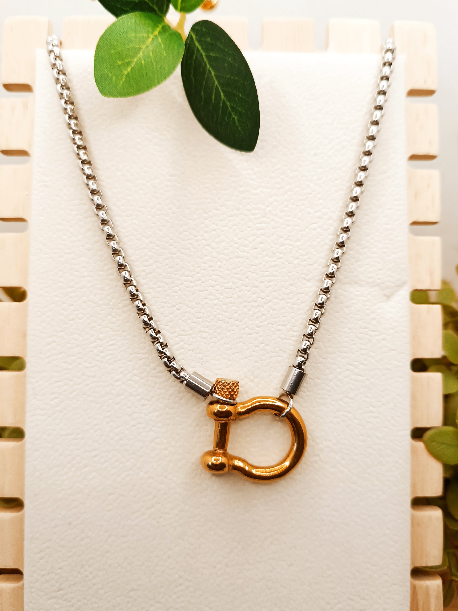 Le collier MANILLE séduit par son design fort et structuré, inspiré des mailles de levage. Sa maille vénitienne ronde argentée, lisse et régulière, contraste avec un pendentif doré graphique en forme de manille, pensé comme une pièce centrale au caractère affirmé.